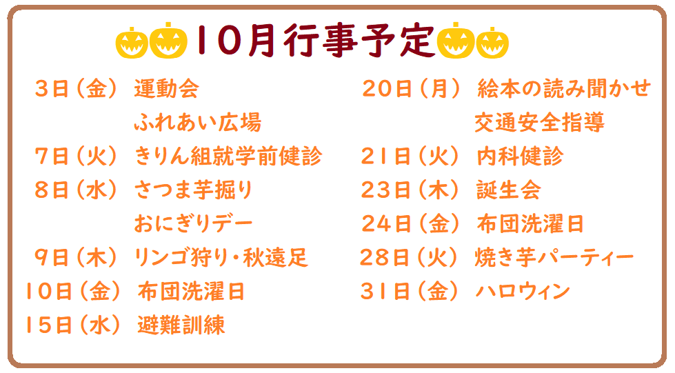 10月行事予定2025-10-01 お知らせ 涼しい秋風と、虫の声に秋の深まりを感じられるようになりました。気温差の大きい季節となりましたので、衣服で調整できるよう着替えの準備をお願いします。 今月も、運動会やリンゴ狩り、焼き芋パーティーやハロウィンなどワクワクな行事がたくさんです🎃体調管理に気を付けながら、今月も元気に過ごしましょう。また、天候により行事が変更となる場合がありますので、ご了承ください。