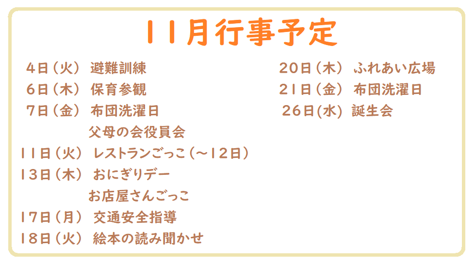 11月行事予定2025-10-31 お知らせ 日が暮れるのが早くなり、朝晩の冷え込みや冷たい風に秋の気配が深まるのを感じるこの頃です。日中の天気のいい日は、安全に気を付けながら園庭での活動を楽しんでいます。 11月はレストランごっこやお店屋さんごっこなど、きりん組さんが大活躍です!保育参観では、保護者の皆様に向けて「歯と口腔の健康について」の講話を予定しておりますので、是非ご参加ください。