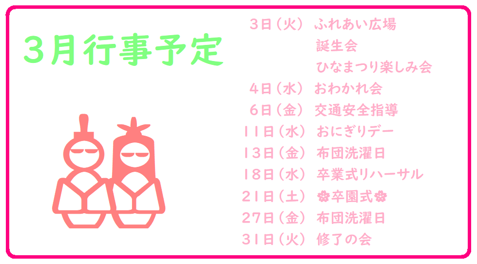 3月行事予定2026-03-02 お知らせ 厳しい寒さも和らぎ、春の陽気を感じられるようになりました。1つ、お兄さんお姉さんになる子ども達を見て、頼もしく感じているこの頃です。 今年度も残りわずかとなりましたが、来年度へ向け少しずつ準備を進めながら、残りの日々を楽しみながら過ごしたいと思います。
